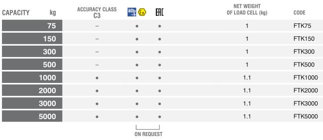 Nominal load (E max): 75 -150 - 300 - 500 kg, 1000 - 2000 - 3000 - 5000 kg