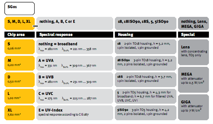 SiC photodiodes are available with seven different active chip areas from 0.06 mm2 up to 36 mm2 Standard version is broadband UVA-UVB-UVC. Four fltered versions lead to a tighter sensitivity range. All photodiodes have a hermetically sealed metal housing (TO type), either a 5.5 mm diameter TO18 housing or a 9.2 mm TO5 housing. Further option is either a 2 pin header (1 isolated, 1 grounded) or a 3 pin header (2 isolated, 1 grounded).