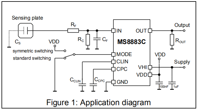 The integrated circuit MS8883C is a capacitive switch that uses a patented (EDISEN) digital method to detect a change in capacitance on a remote sensing plate.