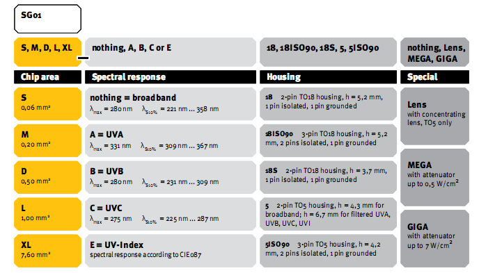 from 0.06 mm2 up to 36 mm2 Standard version is broadband UVA-UVB-UVC.