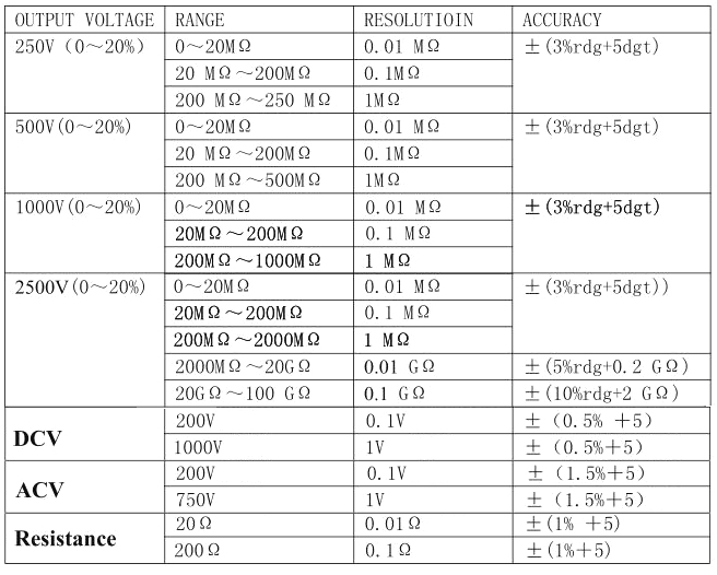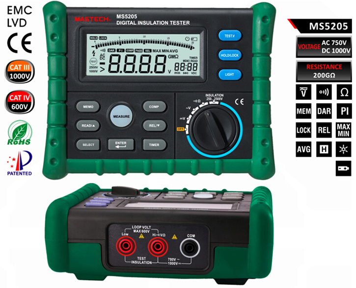The Tester for insulation resistance with test voltage up to 2500V, insulation resistance up to 100G ohm, Short current up to 3mA, continuity, and voltage test functions. The tester performs the automatic calculation of polarization index of dielectric PI and dielectric absorption ratio DAR.
