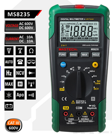 The meter can be used to measure DC and AC voltages and currents, and resistance, test circuit continuity and diodes, detect phone line mode, judge break points in cable lines, track the routing of cable lines, and detect network cable integrity and non-contact voltage.