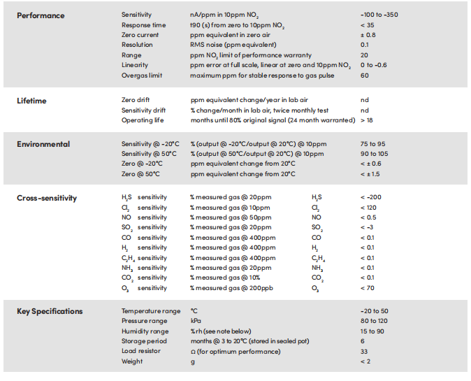 Electrochemical NO2 Nitrogen Dioxide Sensor Miniature Size NO2-H4 specification: