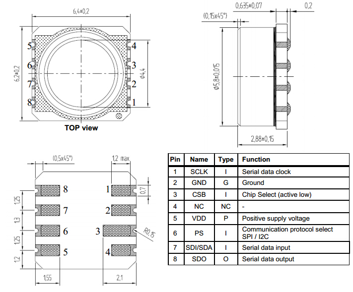 MS5803-14BA Pressure Sensor Module Package Outline and Pin Configuration: