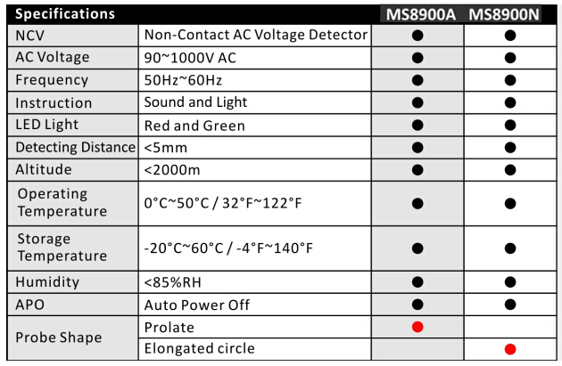 MS8900 Non Contact AC Voltage Detector General Specifications