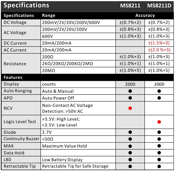 MS8211/MS8211D Digital Multimeter Features