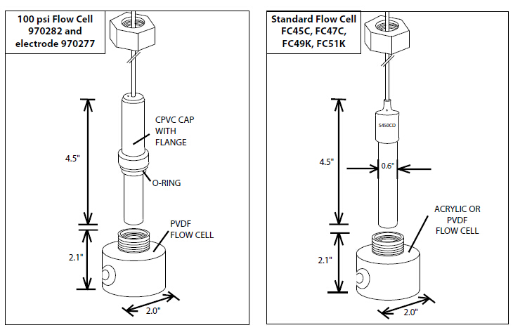 100 psig rated flat pH electrode with double reference junction, 30 inches of cable and connector choice. For use with flow cell 970282 |