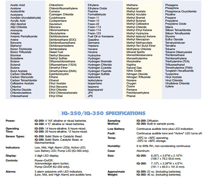 IQ-250 is a single-gas, portable instrument which can be equipped with solid state sensor. Any one of over 150 toxic and combustible gases can be chosen for detection. The sensor is attatched via a coiled cord which allows readings to be taken up to 24" from the unit.