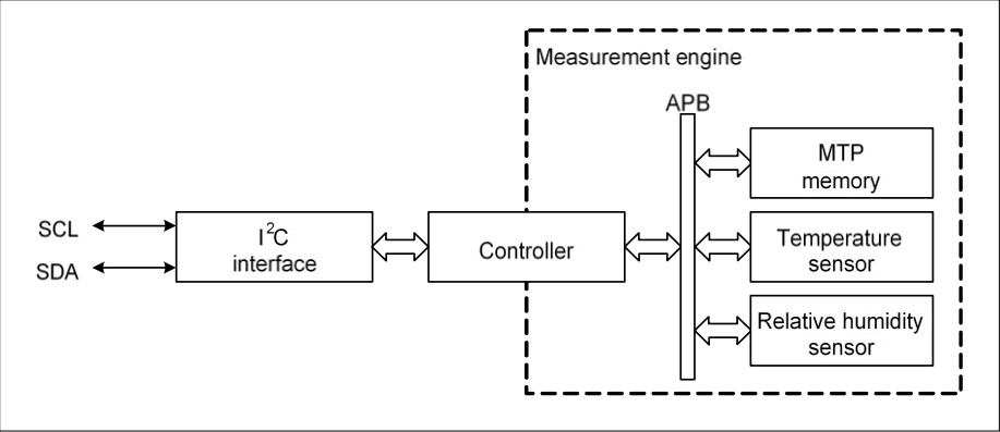 The internal block diagram of ENS210 is shown in Figure 2. The I2C (communication) interface is connected to a controller which acts as the command interpreter and as bus master of the internal Advanced Peripheral Bus (APB). The memory and sensors are slaves of the APB. The MTP memory is used to store the sensor calibration parameters and unique ID.
