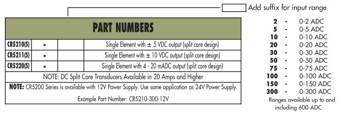 CR5210S Split Core DC Current Transducers PART NUMBERS