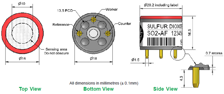The SO2 sensors offer our electrolyte leak-free guarantee and reliable long-term detection performance. The leakproof housing is moulded with a colour coded top for ease of identification.