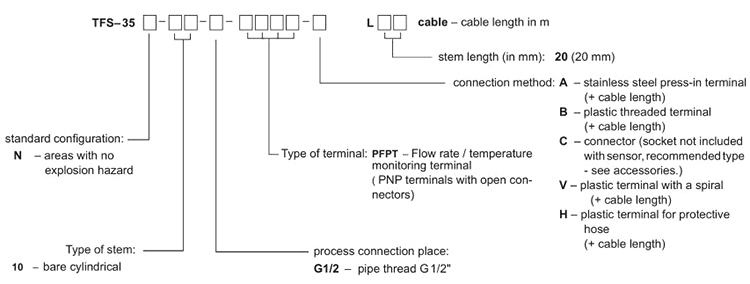 TFS-35N-10-G1/2-PFPT-A-L20 cable 2 m (N) configuration for normal areas; (10) non-insulated cylindrical, (G1/2) process connection with thread G1/2", (PFPT) PNP type flow rate and temperature sensing terminals, (A) stainless steel cable terminal, (L20) length of stem 20mm. cable 2 m)