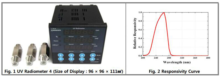 UV Radiometer 4 is 3 Channel indicator. There are 3 type display, and 2 type output (Relay and 4-20 mA).3 type display is the Relative Power (%), Accumulative Time (Hours), and Absolute Power (mW/cm2)